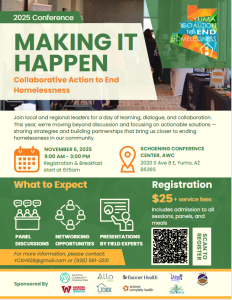 📢 The 2025 YCEH Conference – Making it Happen: Collaboration to End Homelessness will be held on Thursday, November 6, 2025, at the Schoening Conference Center, Arizona Western College.